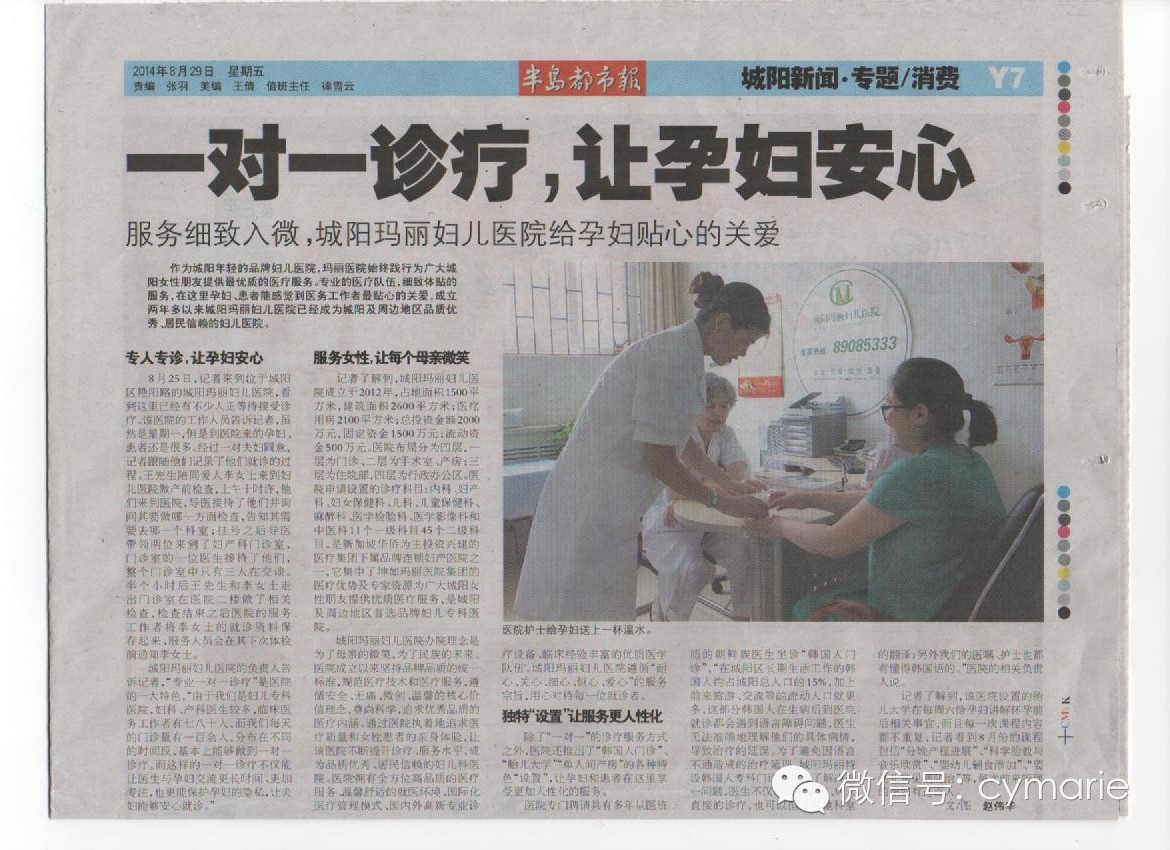 (本文来源:半岛都市报)服务细致入微,城阳玛丽妇儿医院给孕妇贴心的关爱