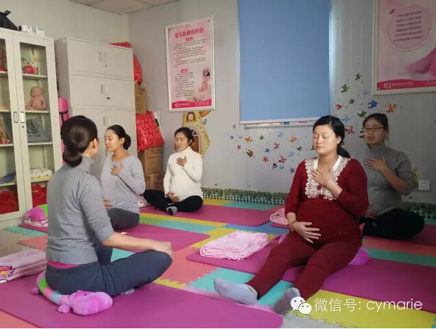 准妈妈们正在练习瑜伽呼吸技巧